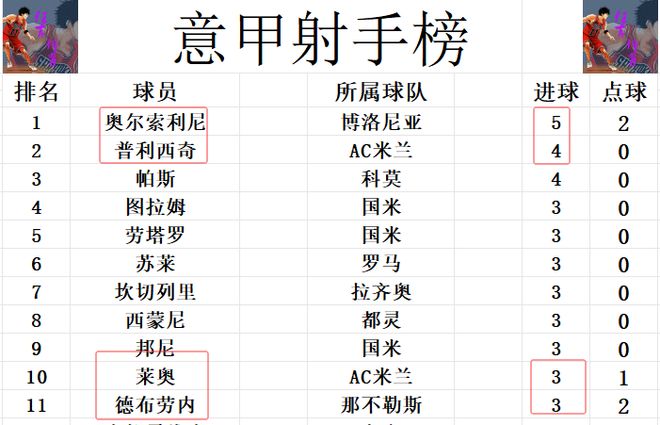 射手榜方面,奥尔索利尼5球领跑,普利西奇伤缺还是4球和帕斯并列第2。莱奥今天打入一球,追上德布劳内,西蒙尼,图拉姆,劳塔罗等人,3球刚好挤入前十。