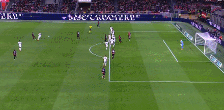 被弱旅将比分追平,AC米兰如梦方醒,加强了攻势,第63分钟,AC米兰左路围攻,莫德里奇45度角拿球横切摆脱防守后直塞,弗法纳禁区弧顶左侧策应脚后跟巧妙做球,莱奥禁区内接球获得很好的机会,莱奥稍作调整大力轰射,BOOM的一声皮球被横梁挡了出来。第85分钟,比萨后场进攻,连续的传递,阿金桑米罗中圈处接球摆脱防守倒地送出超远距离过顶长传,恩佐拉反越位成功场上禁区弧顶处将球卸下获得超级单刀机会,恩佐拉操作调整后冷静穿裆推射得手,比萨连追2球2:1反超了比分。梦幻开局到落后,最后10来分钟AC米兰展开猛烈攻势,补时第2分钟,AC米兰左侧角球机会,一个战术配合后,莫德里奇禁区边上接球横传中路,阿特卡梅禁区弧顶前调整好脚步直接迎球超远距离大力抽射,皮球击中近端门柱内侧弹入网窝,AC米兰2:2绝平比萨。